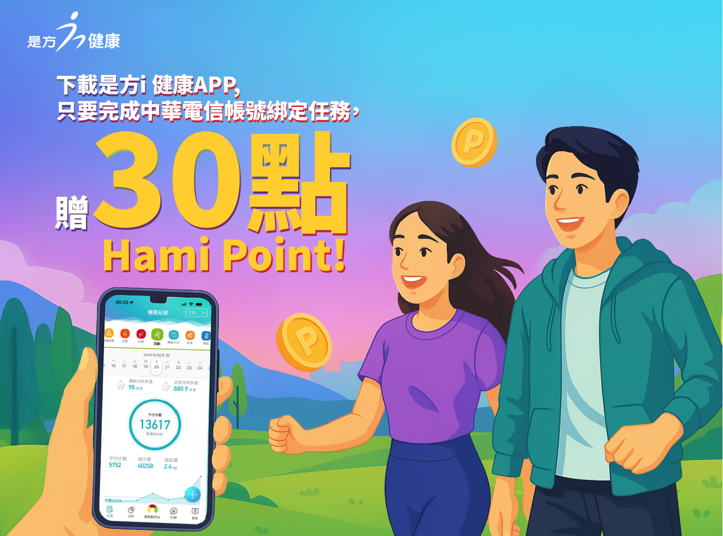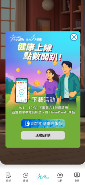活動期間內,下載是方i健康app並連動中華電信帳號實名會員